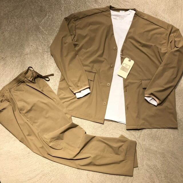 ストレッチの効いたナイロン生地でストレスなく履いて頂けるパンツ、カーディガンのセットアップです✨