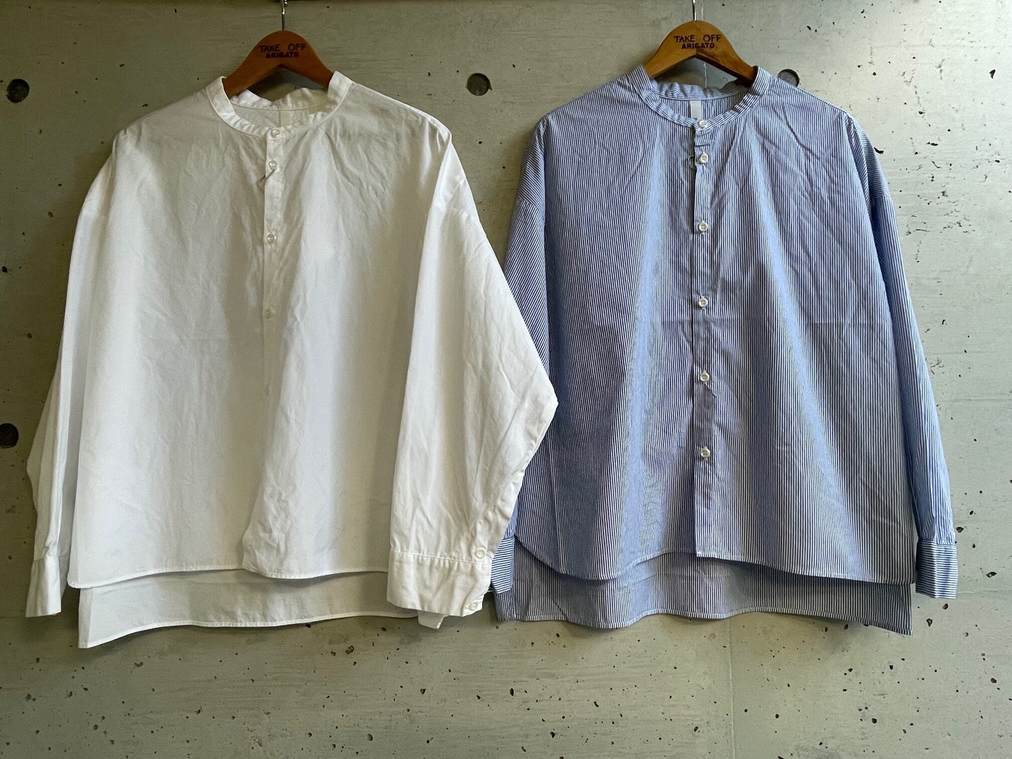 スタンドカラーの開放的な襟元に、肩はドロップショルダーで、身幅も広めなので、体のラインを拾わないゆったりとしたシルエットです。